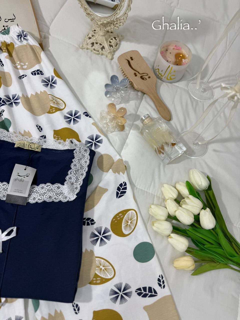 بيجامة ليمون نص كم مطعمه دانتيل كحلي